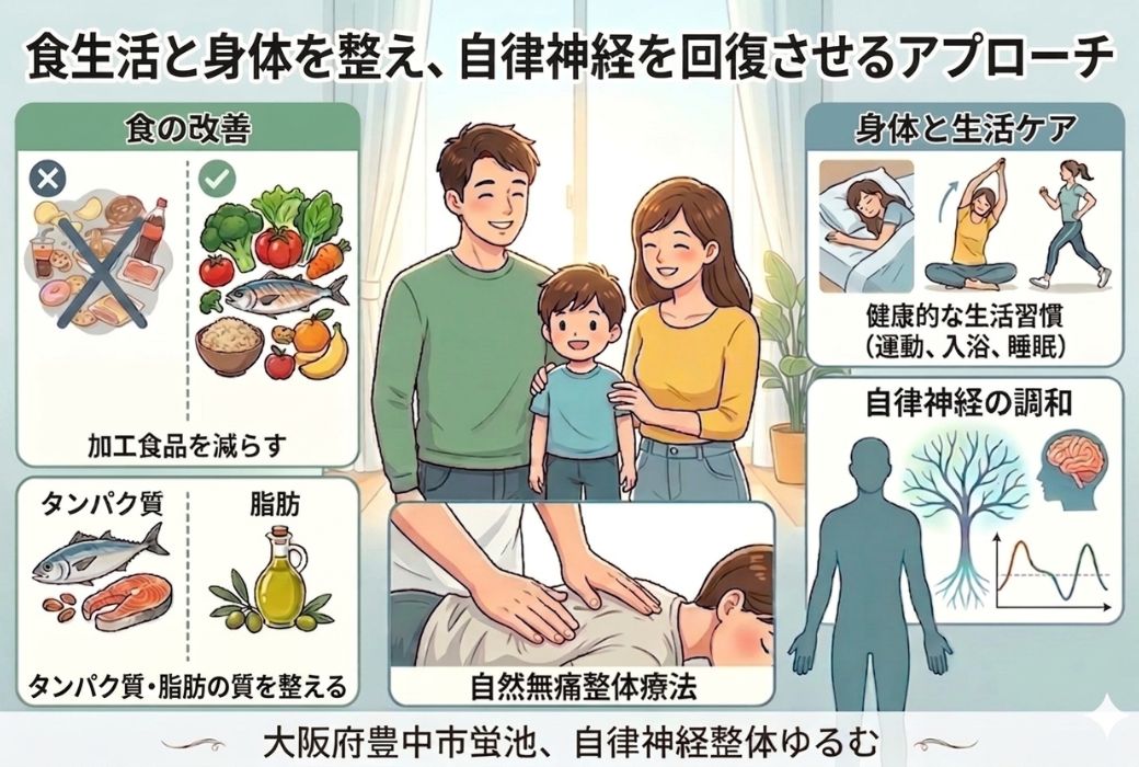 自律神経の乱れは食事だけでなく、身体の緊張状態や生活習慣など複数の要因が関与しています。